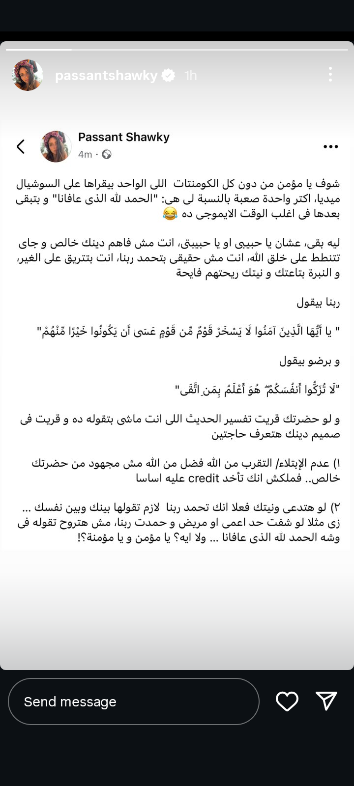 واستكملت: عدم الإبتلاء/ التقرب من الله فضل من الله مش مجهود من حضرتك خالص.. فملكش انك تأخد credit عليه اساسا، لو هتدعى ونيتك فعلا انك تحمد ربنا لازم تقولها بينك وبين نفسك … زى مثلا لو شفت حد اعمى او مريض و حمدت ربنا، مش هتروح تقوله فى وشه الحمد لله الذى عافانا … ولا ايه؟ يا مؤمن و يا مؤمنة؟!.