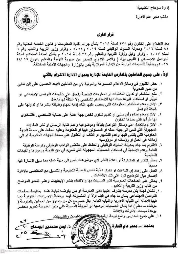 وجهت مديريات التربية والتعليم والتعليم الفني بمحافظة سوهاج، خطابا للإدارات التعليمية شددت خلاله على ضرورة الالتزام بتنفيذ الآتي: