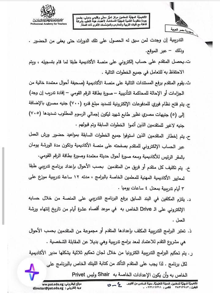 أ. يتقدم من يرغب في التقدم للإعتماد طبقا للشروط المحددة بعاليه بتسجيل استيفاء استمارة التقدم الإلكترونية على الموقع الرسمي للأكاديمية المهنية للمعلمين: www.pat.edu.eg في الفترة من يوم الأحد ۲۰۲۵/۱۱/۲ إلى يوم الخميس ٢٠٢٥/١١/۱۳ مع مراعاة أن يختار المتقدم المجال المطابق لتخصصه على وظائف الكادر طبقا لما هو مدون في صحيفة الأحوال مؤهله.