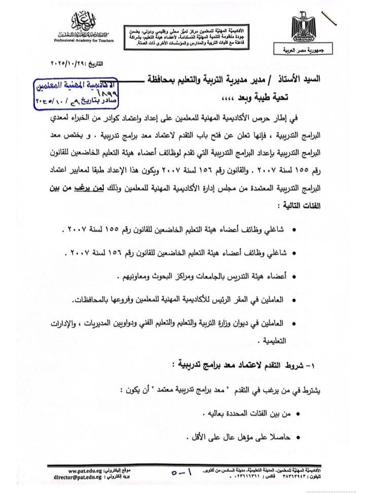 فتح باب التقدم لاعتماد معد برامج تدريبية لشاغلي وظائف التعليم
