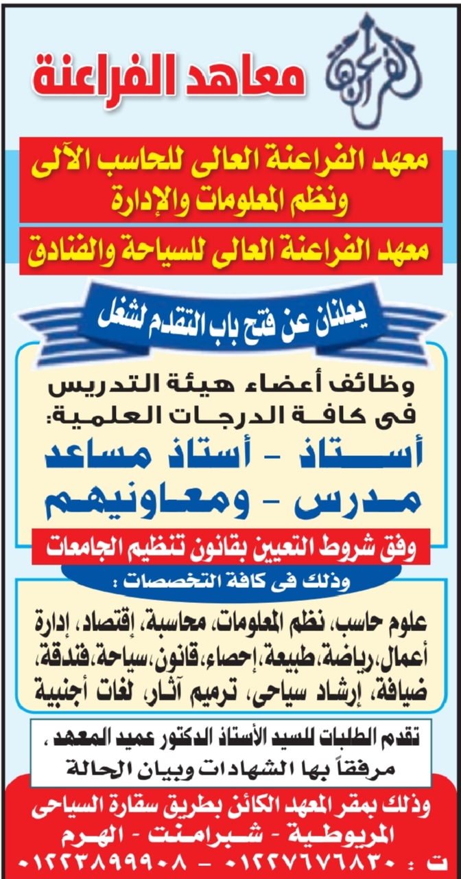 وتقدم الطلبات على وظائف معاهد الفراعنة، للدكتور عميد المعهد، مرفقًا بها الشهادات وبيان الحالة، وذلك بمقر المعهد الكائن بطريق سقارة السياحي المريوطية – شبرامنت – الهرم – ٠١٢٢٧٦٧٦٨٣٠ – ٠١٢٢٣٨٩٩٩٠٨.