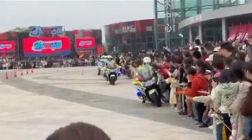 شرطة صينية تفقد السيطرة على دراجة نارية وتصدم جمهور يوم الشرطة المفتوح